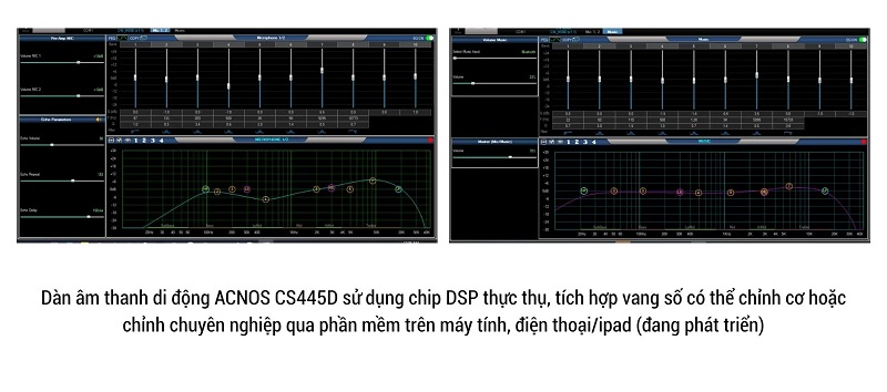 Dàn âm thanh di động ACNOS CS445D sử dụng chip DSP thực thụ, Tích hợp vang số cho phép chỉnh cơ (Phần mềm chỉnh âm thanh chuyên nghiệp dùng cho khách hàng am hiểu về âm thanh hoặc có yêu cầu khắc khe về âm sắc sẽ ra mắt trên máy tính và thiết bị di động trong thời gian sắp tới).Máy khắc phục nhiễu nền tốt ngay cả khi mở mic. Nút nguồn ngay trên mặt máy giúp dễ dàng thao tác và tính năng tắt mềm không tiêu thụ điện.