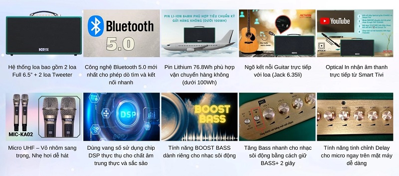 - Loa hỗ trợ các cổng kết nối tiệng dung cho phép nhận âm thanh từ nhạc cụ thuần như Guitar, hay nhận âm thanh trực tiếp từ thiết bị thông minh như Smart Tivi