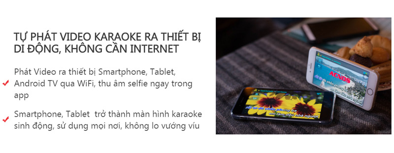 Hát karaoke ngay cả khi không cần internet. Có cổng Kết nối HDMI với mọi TV LCD/LED dành cho các phòng hát gia đình. Tự phát WiFi cho kết nối không dây cho 8 thiết bị điều khiển, chọn bài và xem video cùng lúc qua ứng dụng Karaoke Connect hoặc hát karaoke online, trộn bài YouTube qua ứng dụng Cloud karaoke.