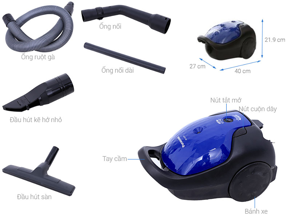 - Khoang chứa bụi:Dùng túi chứa bụi 1.4 lít