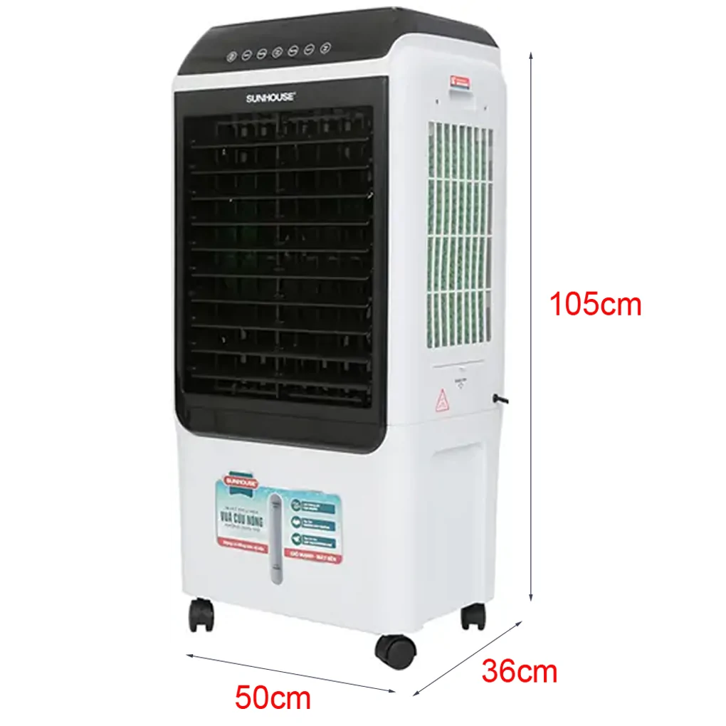 Máy làm mát Sunhouse hoạt động với công suất 150W, có khả năng làm mát hiệu quả và nhanh chóng trong không gian có diện tích khoảng 25-30m².