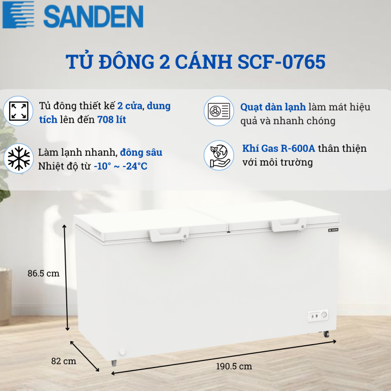 Tủ đông Sanden SCF-0765 dung tích 708 lít, kích thước 1905x820x865 mm, là lựa chọn lý tưởng cho hộ gia đình, nhà hàng, quán ăn, quán cà phê, cửa hàng thực phẩm, siêu thị và ngành thủy hải sản. Sản phẩm có khả năng làm lạnh nhanh, giữ nhiệt ổn định, tiết kiệm điện, giúp bảo quản thịt cá, hải sản, đồ đông lạnh và nguyên liệu chế biến luôn tươi ngon