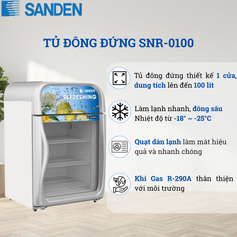 Tủ đông Sanden SNR-0100 với thiết kế đứng 1 cánh nhỏ gọn và dung tích 100 lít được ứng dụng rộng rãi trong nhiều ngành nghề khác nhau nhờ khả năng làm lạnh nhanh, tiết kiệm điện và vận hành ổn định.