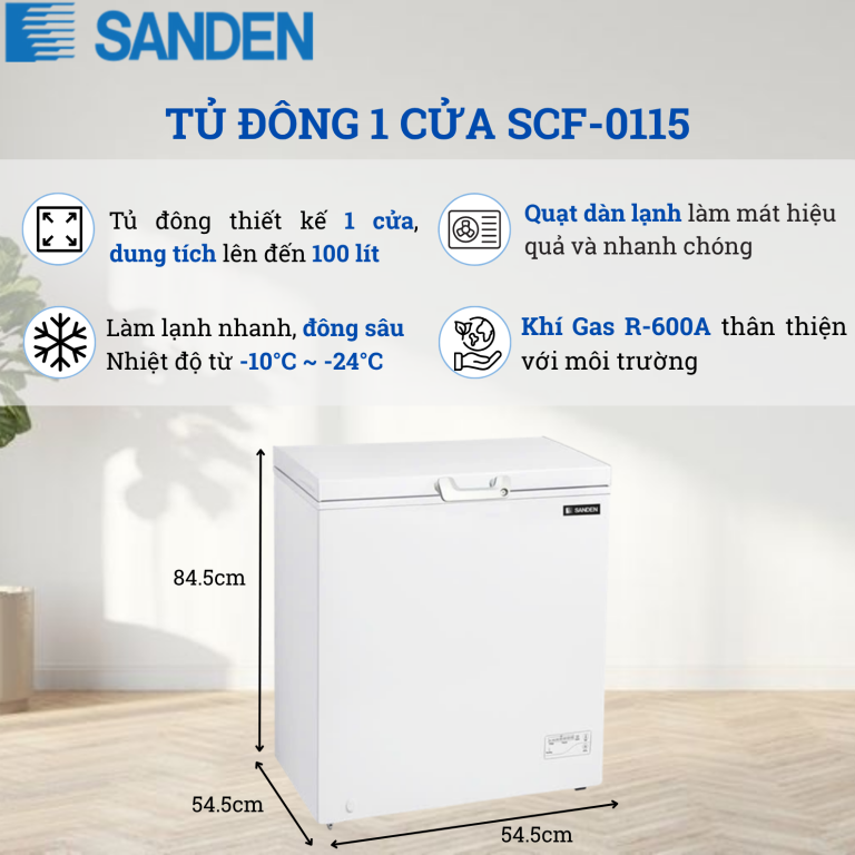 Với thiết kế nhỏ gọn, dung tích 100 lít và khả năng làm lạnh nhanh, tiết kiệm điện, tủ đông Sanden SCF-0115 là lựa chọn lý tưởng cho hộ gia đình, cửa hàng tiện lợi, quán ăn, quán cà phê hoặc nhà hàng nhỏ. Sản phẩm giúp bảo quản thịt cá, hải sản, đồ đông lạnh một cách hiệu quả, đồng thời tiết kiệm không gian và chi phí vận hành. Nhờ kiểu tủ 1 cánh cửa cứng giữ lạnh tốt, SCF-0115 mang đến hiệu quả bảo quản tối ưu cho mọi nhu cầu sử dụng trong môi trường kinh doanh nhỏ và gia đình hiện đại.
